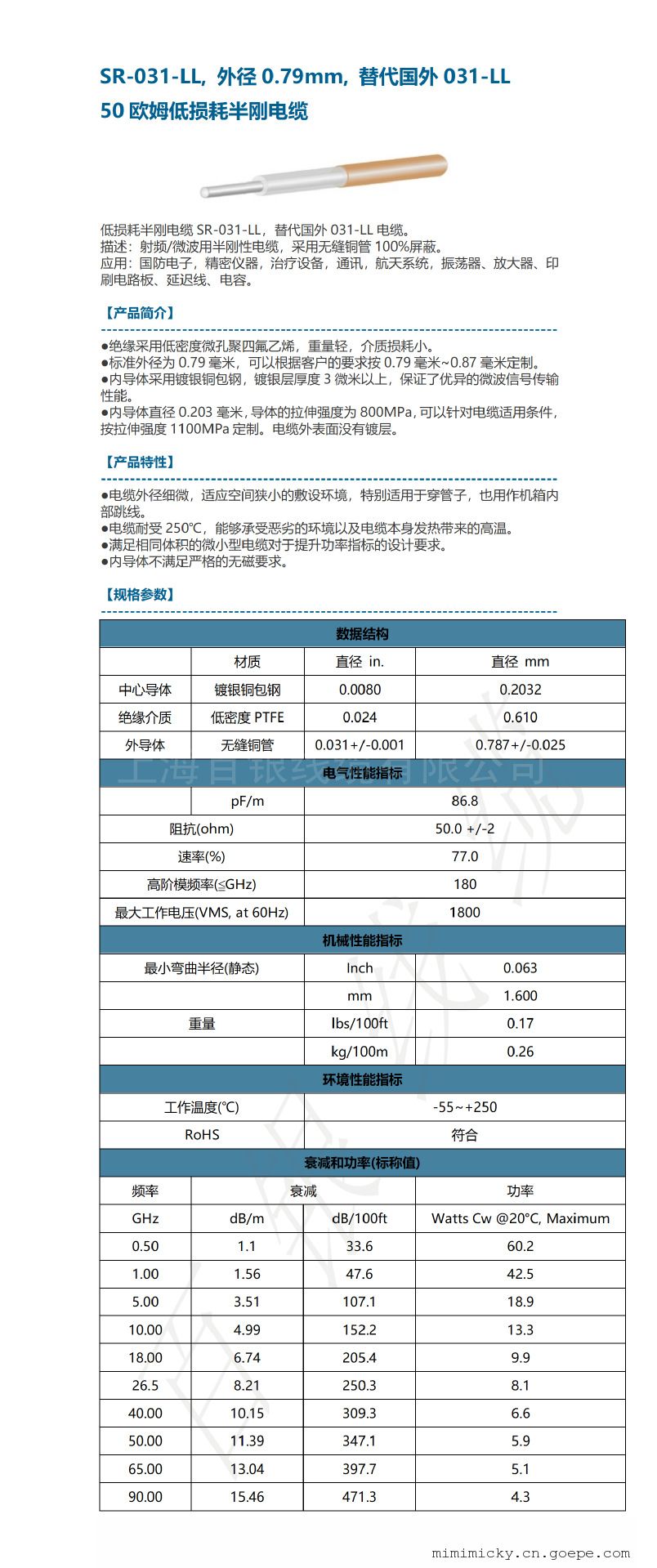 数据结构型号 规格 材料 绝缘 外导体 外径mm BingSR-020 1/0.127 镀银铜包钢 PTFE 无缝铜管 0.535+/0.025 BingSR-024 1/0.127 镀银铜包钢 PTFE 无缝铜管 0.58+/0.025 BingSR-024-HP 1/0.152 镀银铜包钢 PTFE 无缝铜管 0.6+/0.025 BingSR-031 1/0.2 镀银铜包钢 PTFE 无缝铜管 0.8+/0.025 BingSR-031-LL 1/0.2 镀银铜包钢 PTFE 无缝铜管 0.787+/0.025 BingSR-034 1/0.2 镀银铜包钢 PTFE 无缝铜管 0.85+/0.025 BingSR-034-LL-HP 1/0.225 镀银铜包钢 PTFE 无缝铜管 0.86+/0.025 BingSR-039-45 1/0.30 镀银铜包钢 PTFE 无缝铜管 0.991+/0.025 BingSR-043 1/0.30 镀银铜包钢 PTFE 无缝铜管 1.1+/0.025 BingSR-063 1/0.41 镀银铜包钢 PTFE 无缝铜管 1.6+/0.025